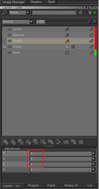 shuffle조정 레이어는 'rgb'를 각각 채널별로