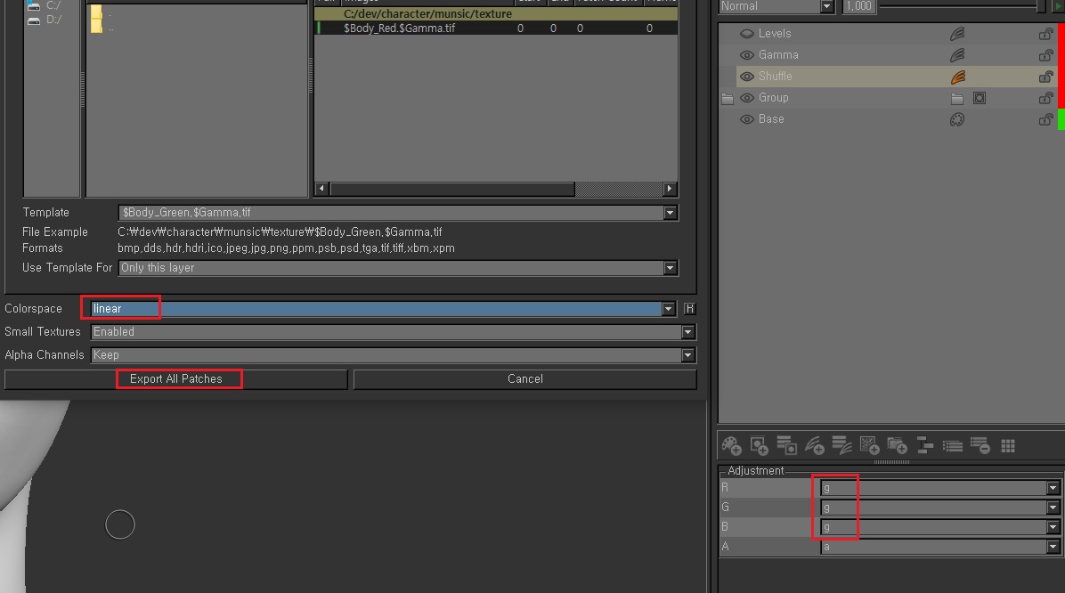 그린, 블루채널에서는 코 레이어를 함께 내보내기를 하고,