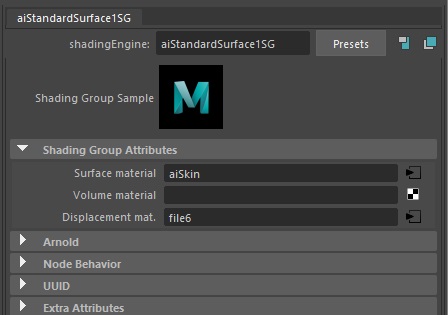 SG(Shading Group)노드의 Displacement mat.항목에 따로 연결한다.