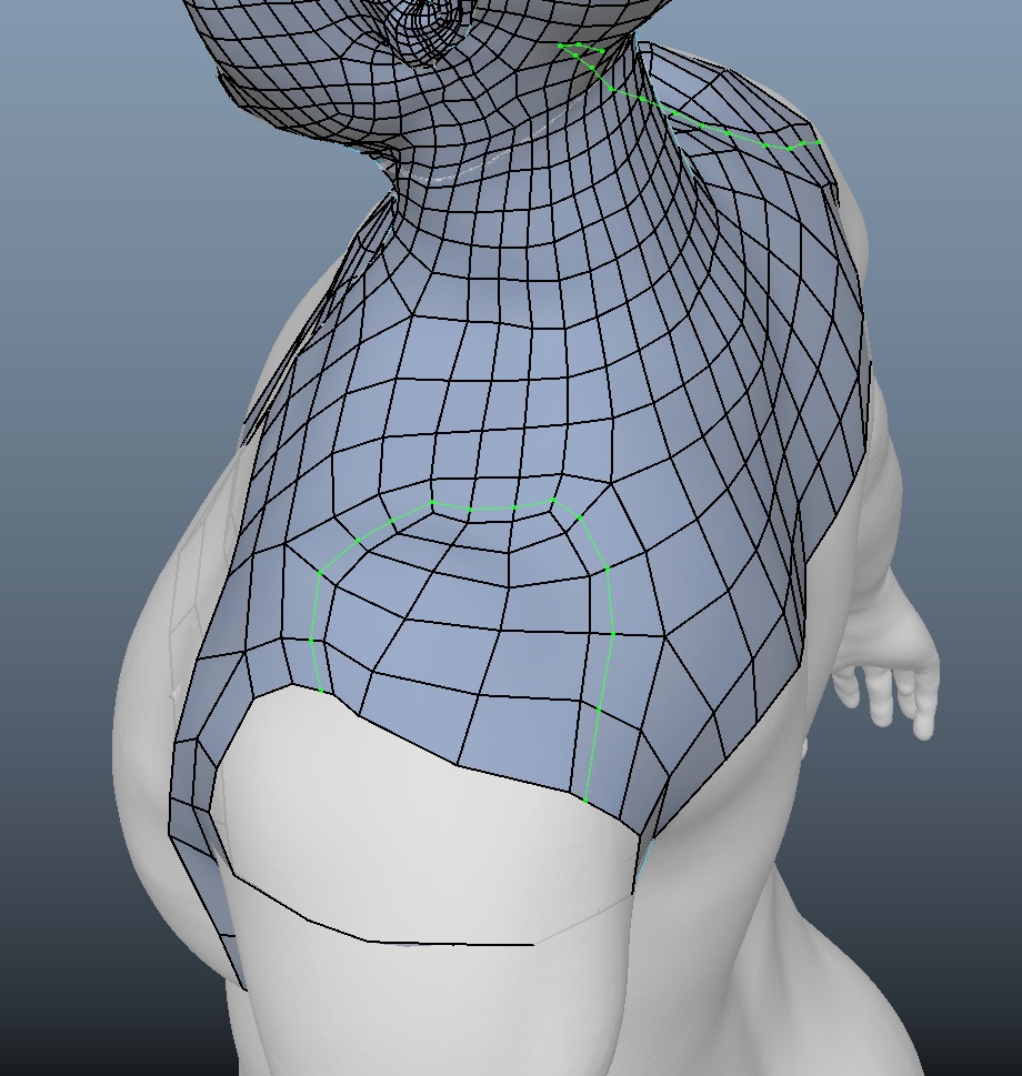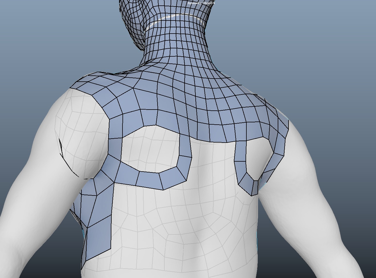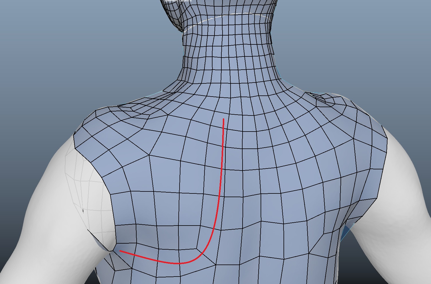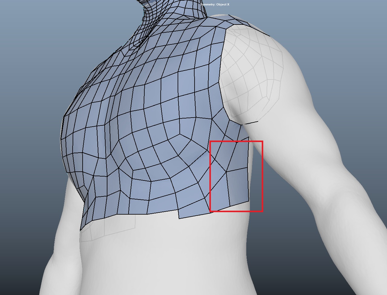 어깨 라인이 구분되지 않으면, 어깨를 움직이는 '리깅 -애니메이팅'에서 해당 부분의 동작과 현실의 괴리감이 발생한다. 따라서 '목 - 어깨 - 팔'로 연결되는 라인이 연결되지 않도록 주의한다.