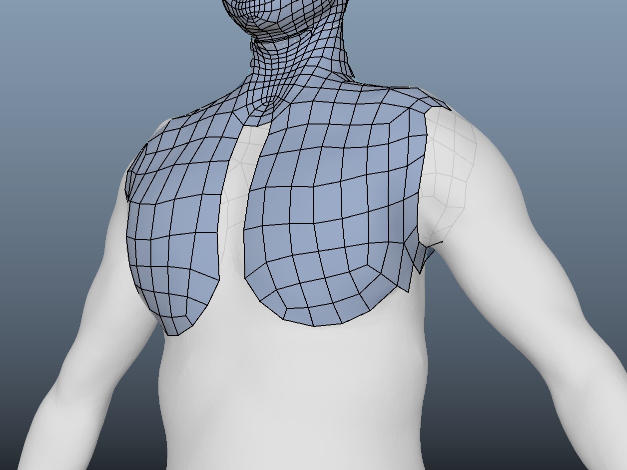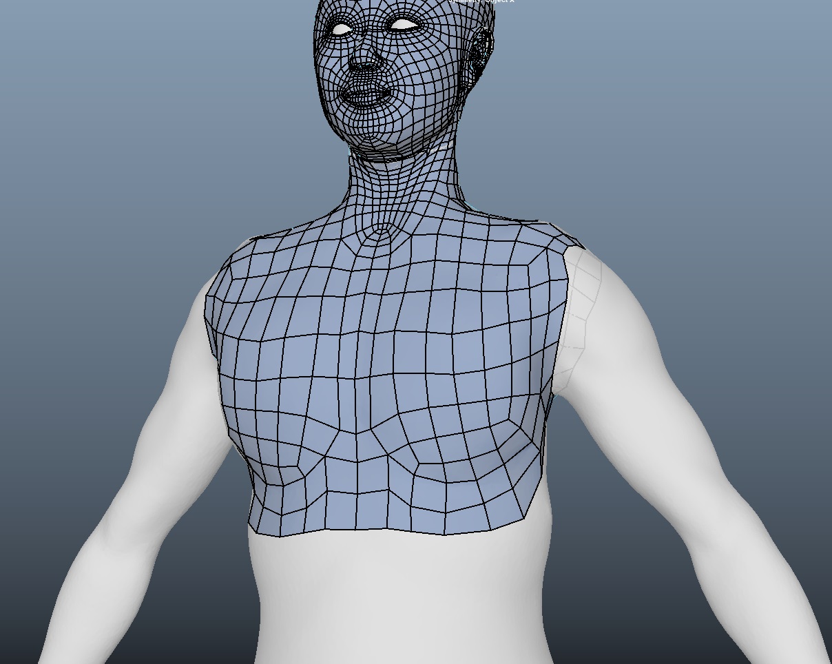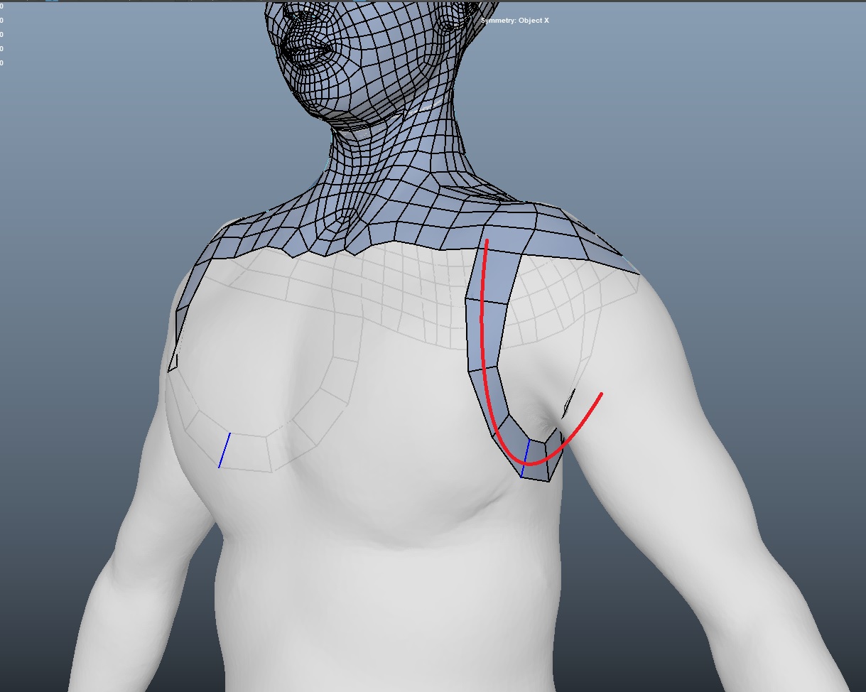 어깨 라인이 구분되지 않으면, 어깨를 움직이는 '리깅 -애니메이팅'에서 해당 부분의 동작과 현실의 괴리감이 발생한다. 따라서 '목 - 어깨 - 팔'로 연결되는 라인이 연결되지 않도록 주의한다.