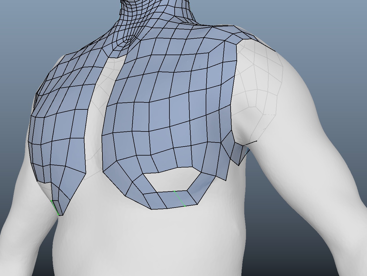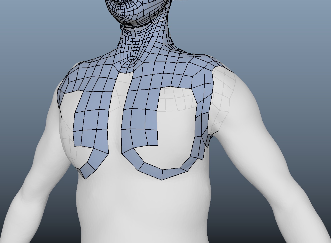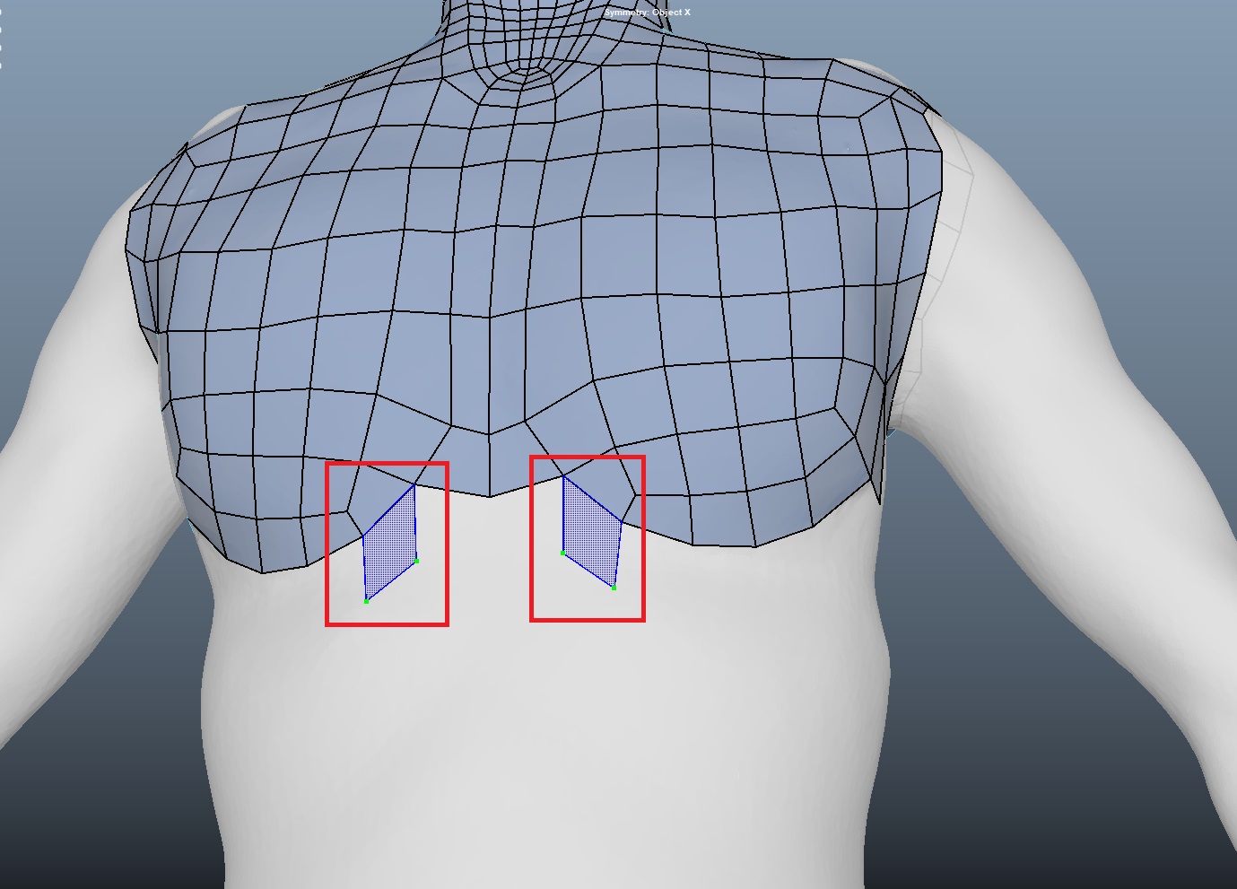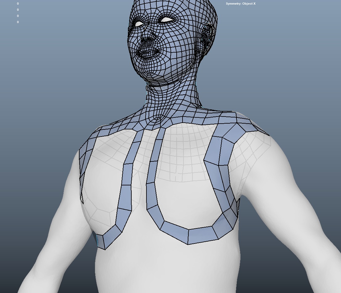 어깨 라인이 구분되지 않으면, 어깨를 움직이는 '리깅 -애니메이팅'에서 해당 부분의 동작과 현실의 괴리감이 발생한다. 따라서 '목 - 어깨 - 팔'로 연결되는 라인이 연결되지 않도록 주의한다.