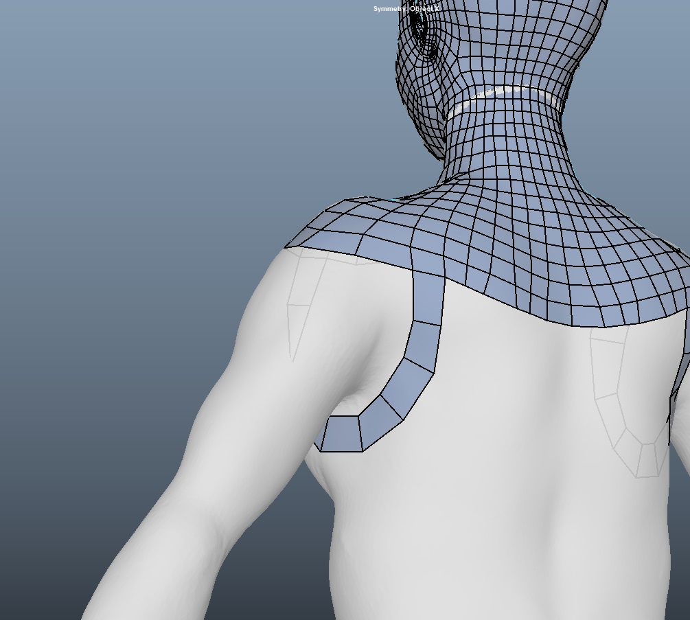 뒤쪽에서 봤을 때, 목에서 내려오는 사각근 라인과 연결이 되어야한다. '목 - 어깨'를 둥글게 연결하는 첫 라인은 중요하다. 해당 라인의 면수가 곧 '팔 - 손목'의 둘레가 되기 때문이다. 면수가 너무 과하지 않도록 주의하며 라인을 생성해준다.