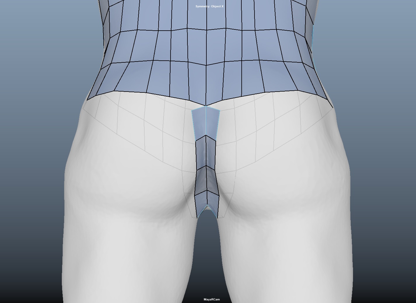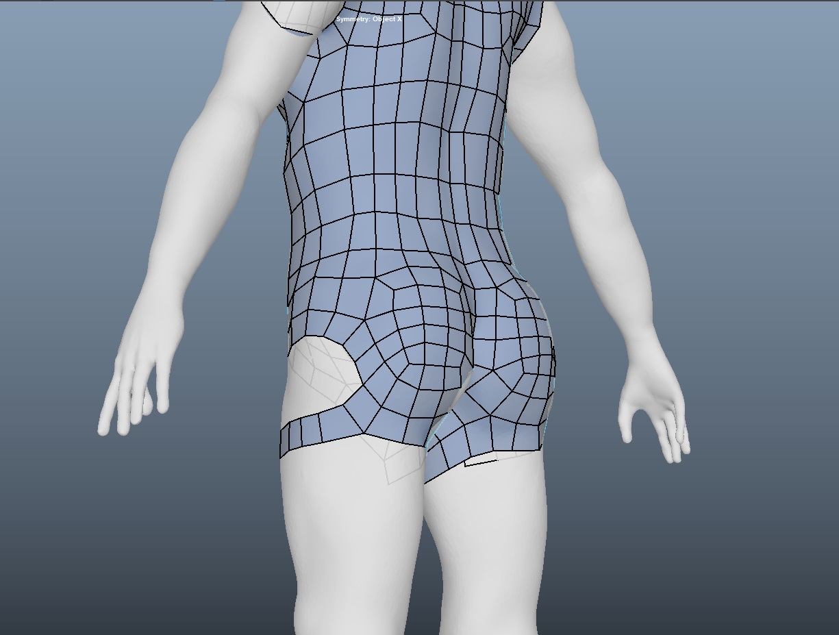 엉덩이 부위는 다른 부위에 비해 면수를 조금 늘려줘야한다. 엉덩이 부위의 면수가 부족하다면, 다리를 들어올리는 동작에서 엉덩이 부위가 사라져버린다. 따라서 아래와 같이 내부의 라인을 조금씩 채워주며 면수를 늘려준다.