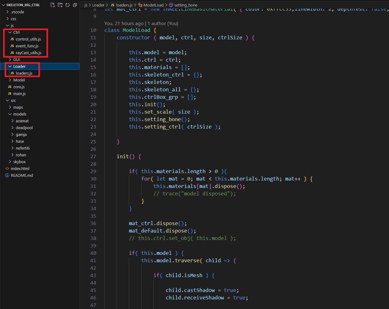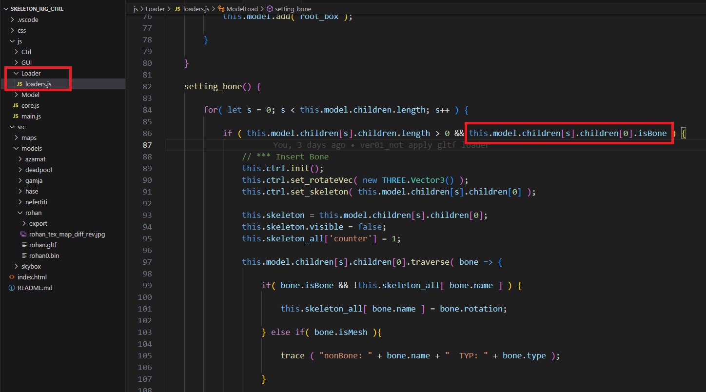 만일, 캐릭터의 조인트와 폴리곤이 그룹 내에 위치한다면, 위의 깃허브 코드가 실행되지 않는다. 왜냐하면, loader.js 파일에서 루프구문이 1단계로 이뤄져 있기 때문이다.