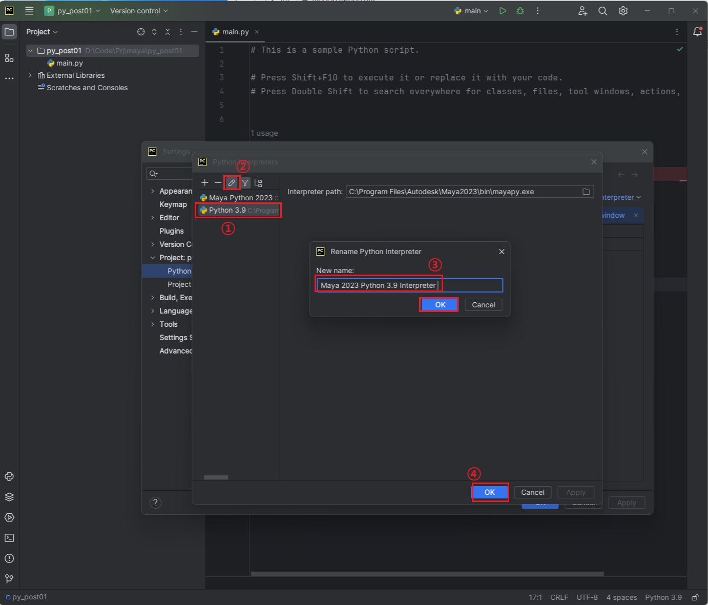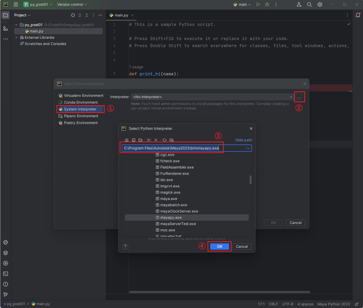 - 현재 python버전을 maya스크립트 에디터의 인터프리터로 연결(mayapy.exe)