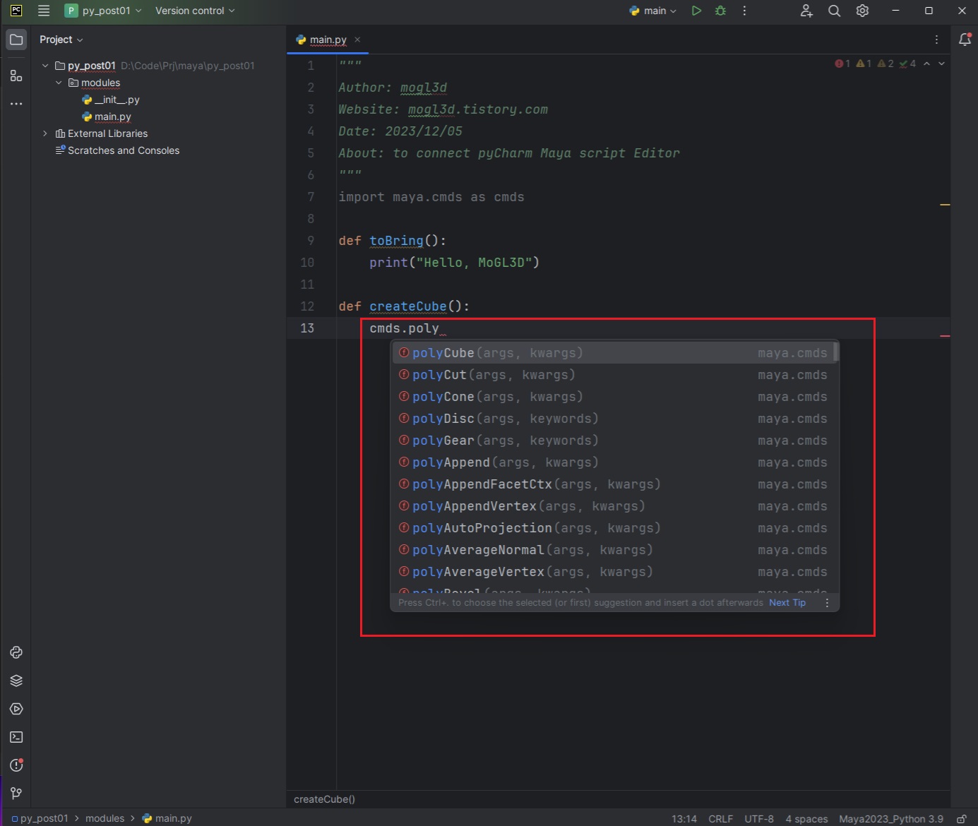 - pyCharm에서 Maya 모듈 관련 명령어가 자동으로 생성 됨