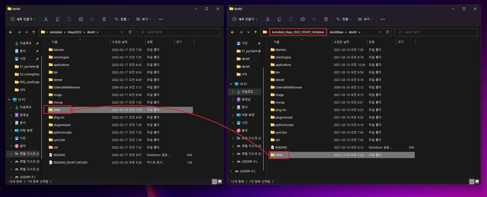 - devkit2022 폴더 내 'other'폴더를 통째로 "Program Files/Autodesk/Maya_ver/devkit/"폴더로 이동