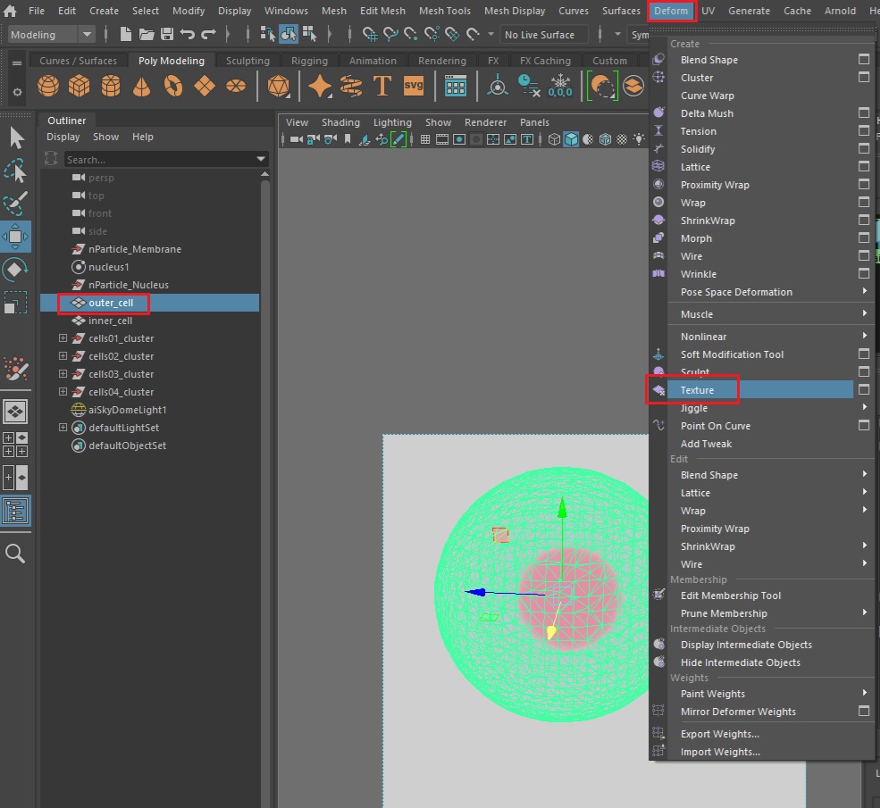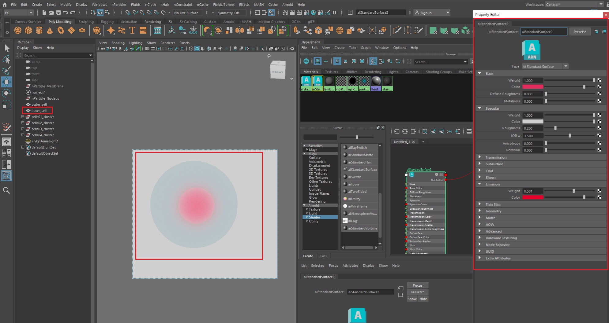 아놀드 랜더링을 실행할 예정이므로 세포막, 세포핵 모두 aiStandardSurface쉐이더를 적용해준다.