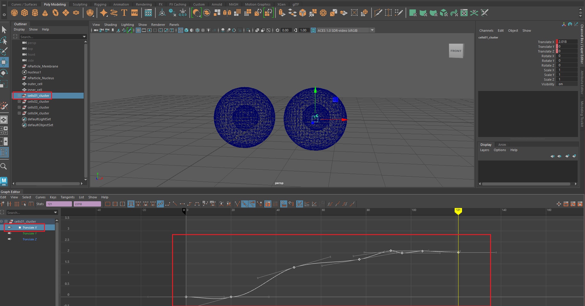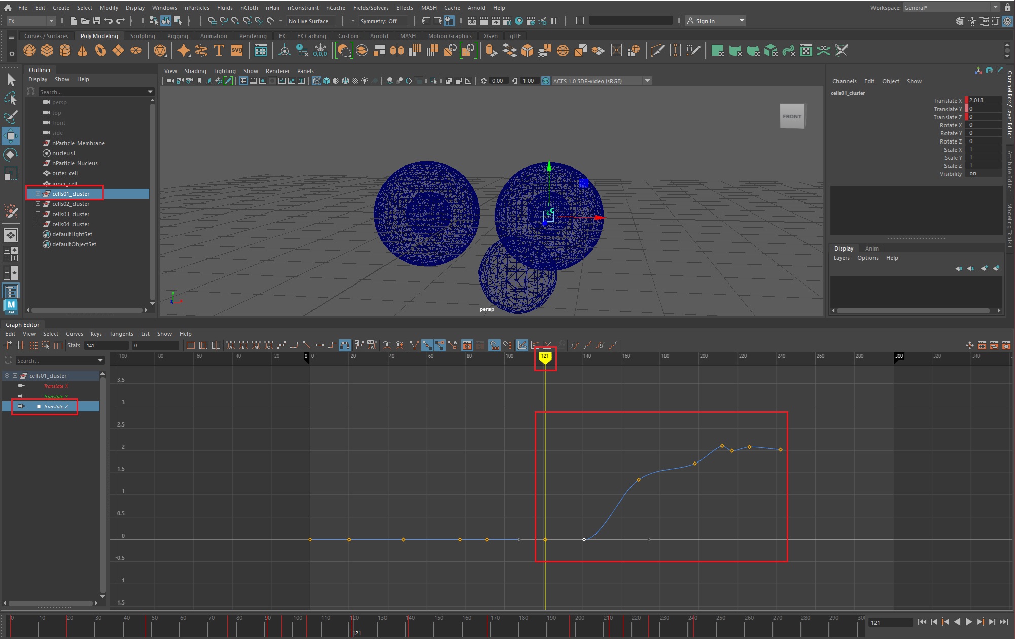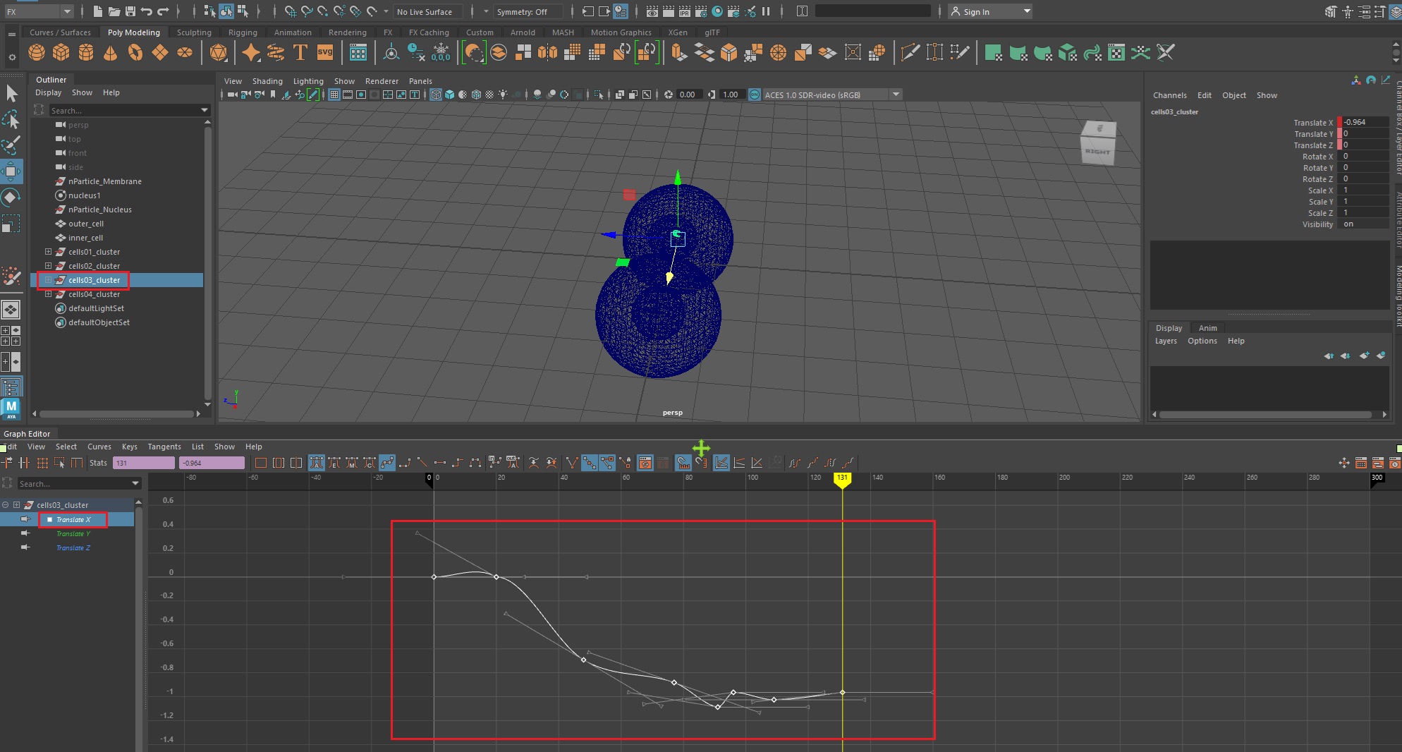 우선, 그래프 에디터(Windows > Animation Editors > Graph Editor)를 실행한 후, 1번 세포체의 translateX값을 복사한다.