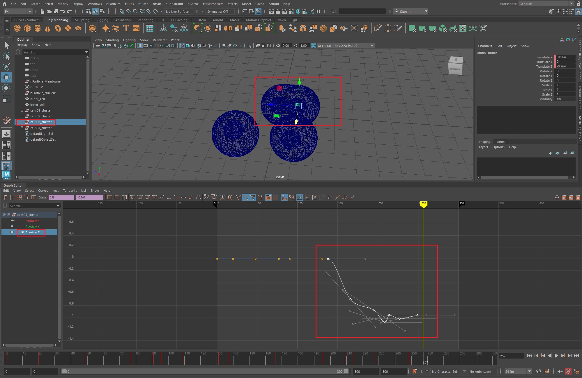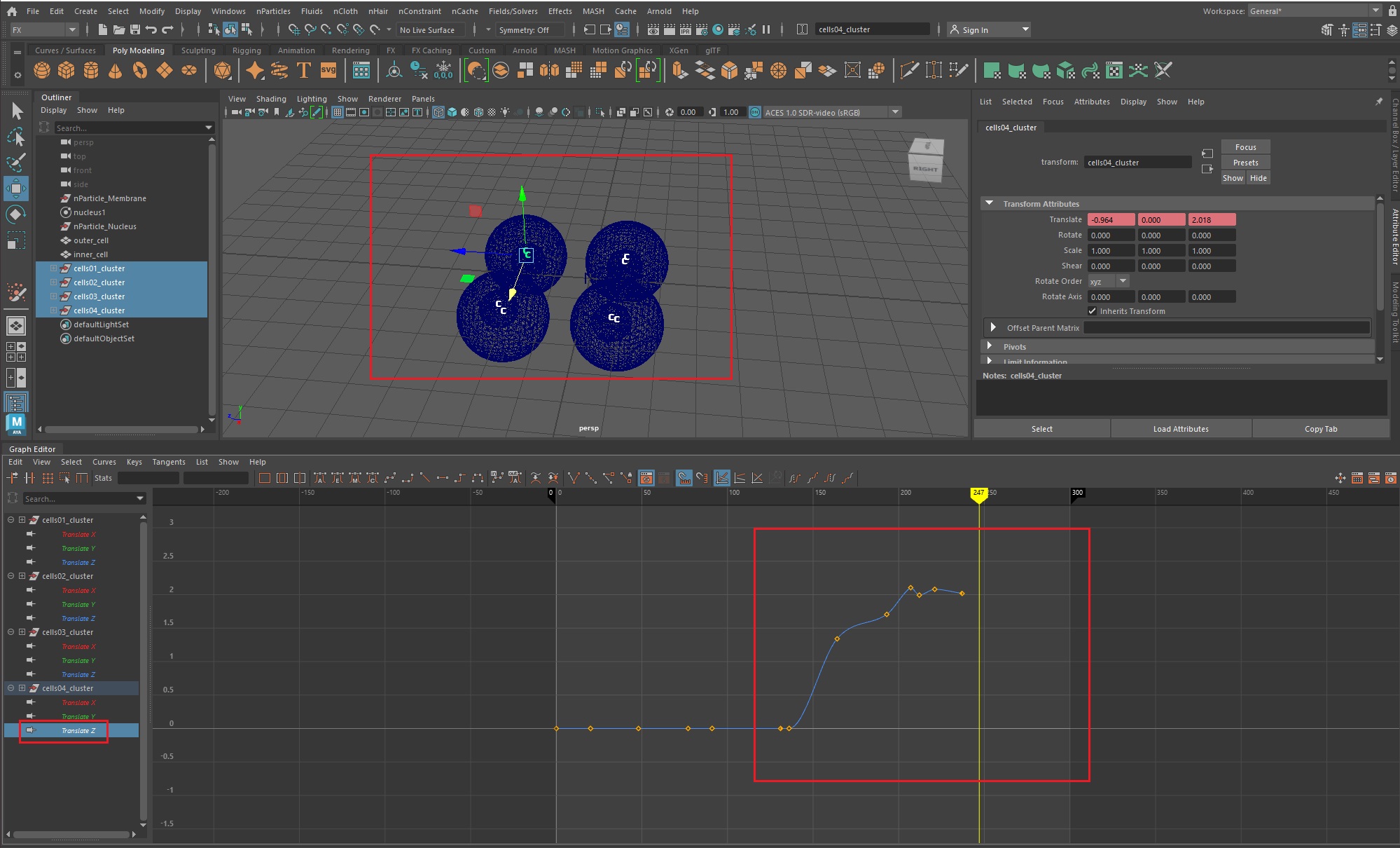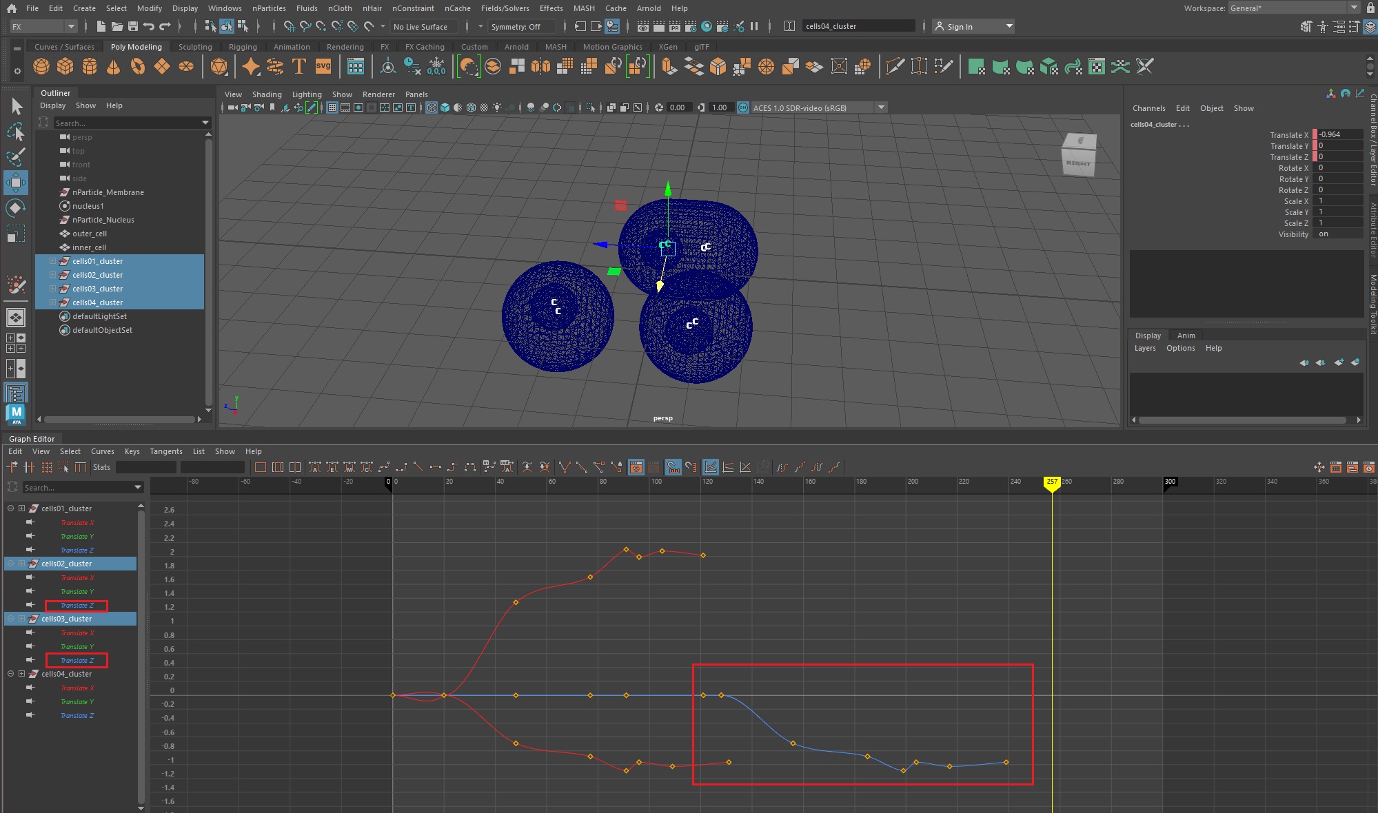 우선, 그래프 에디터(Windows > Animation Editors > Graph Editor)를 실행한 후, 1번 세포체의 translateX값을 복사한다.