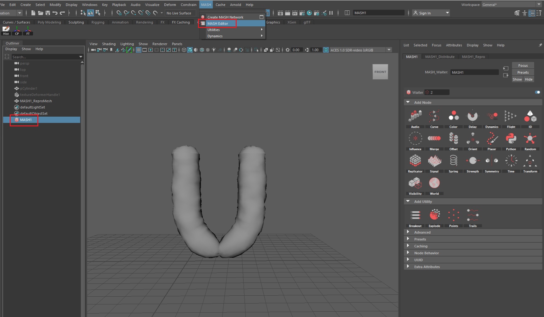 염색체 몸통 4구역 중에서 1구역이 완성됐다. 여기서 모델링을 3번 복사해서 억지로 짜깁기를 해서 모델링을 완성할 수도 있다. 그렇지만 그렇게 했을 때, 염색체 수가 1,000개 이상 늘어나면 마야가 셧다운 될 수가 있다. 그래서 MASH인스턴스 기능을 적극적으로 활용하는 편이 건강에 좋다. 염색체 모델링을 클릭한 상태에서 MASH를 실행한다.