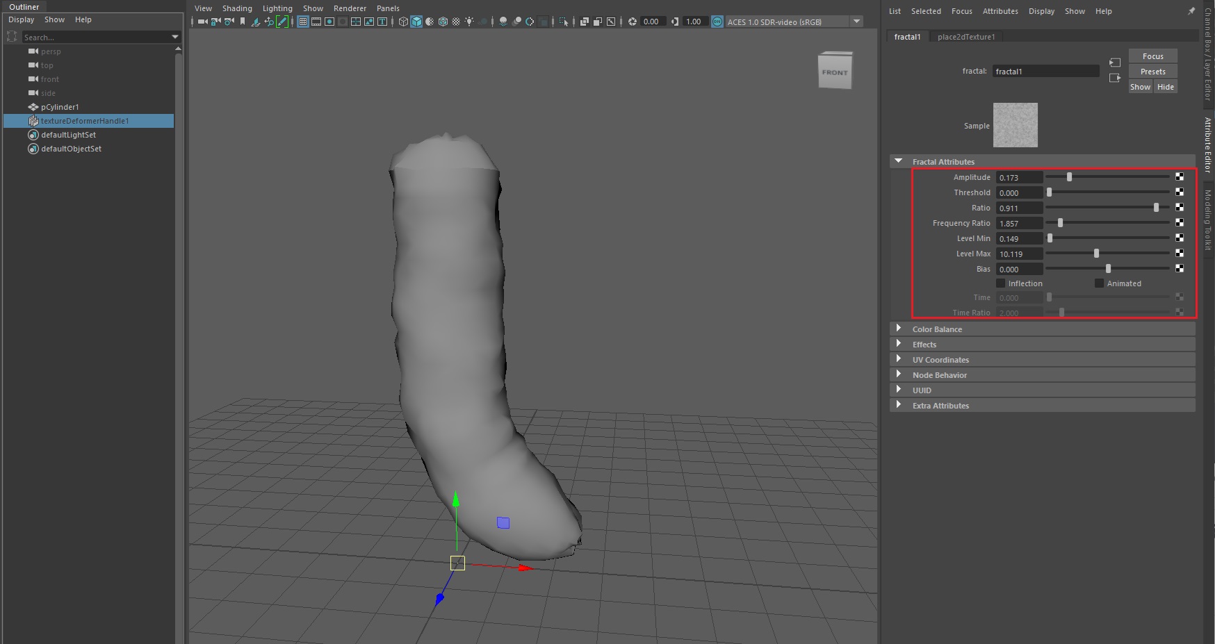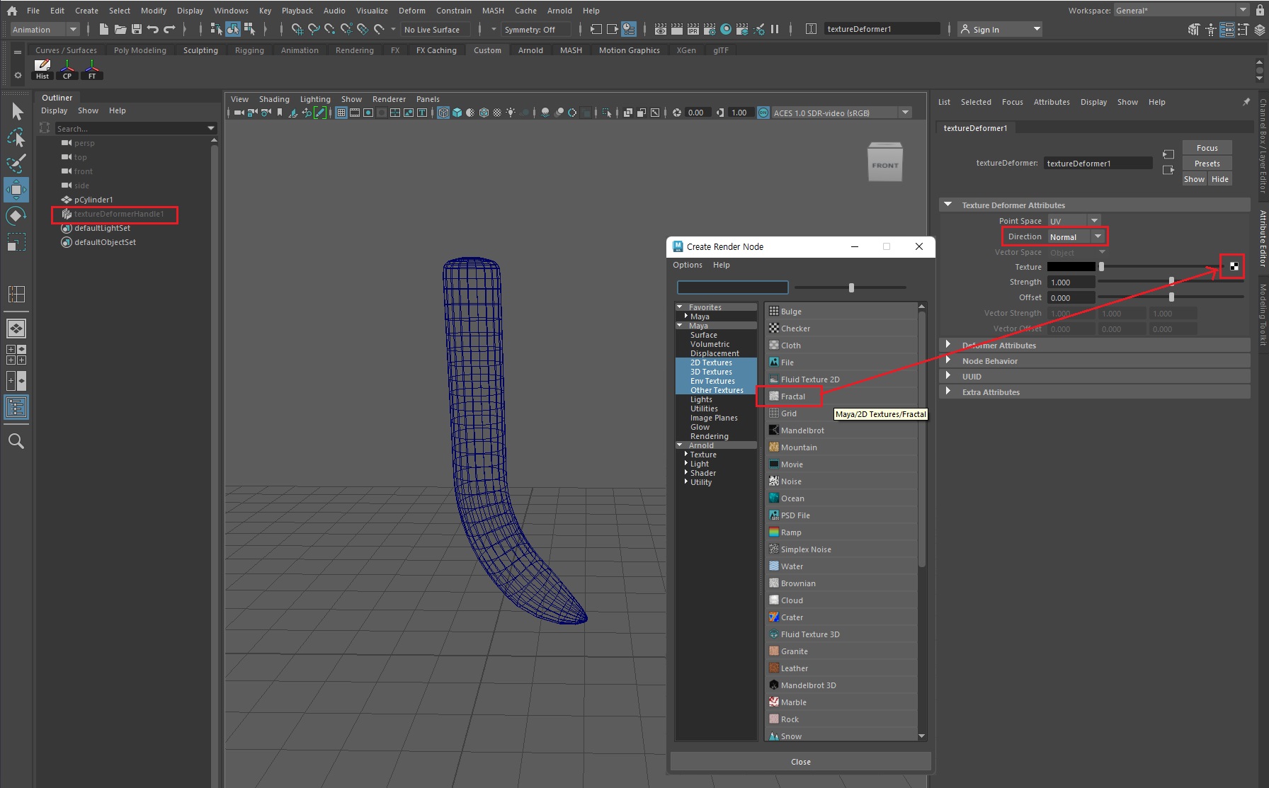 Deform Texture속성에서 파일을 클릭한 뒤 'Fractal'노드를 선택한다. Fractal은 혼란스러운 문양을 가지고 있어서 울퉁불퉁한 표면을 표현하기에 좋은 (내장)텍스처다.