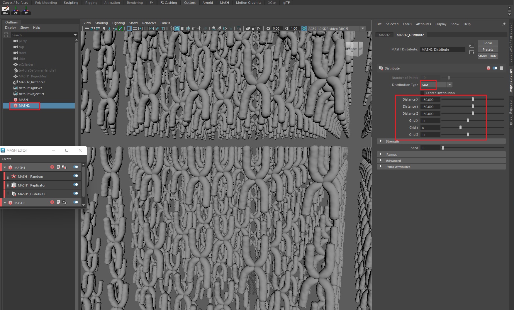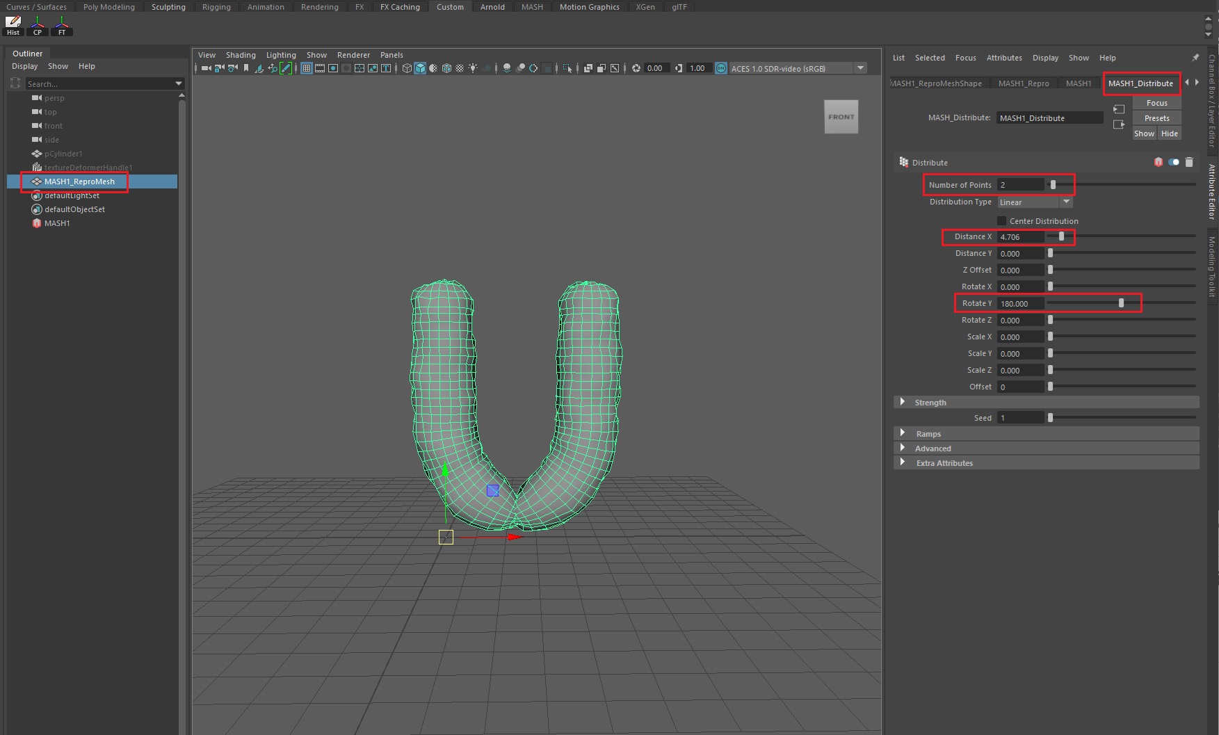 MASH의 Distribute노드에서 개수를 2개로 줄인 후, 회전과 위치값을 아래와 같이 수정한다.