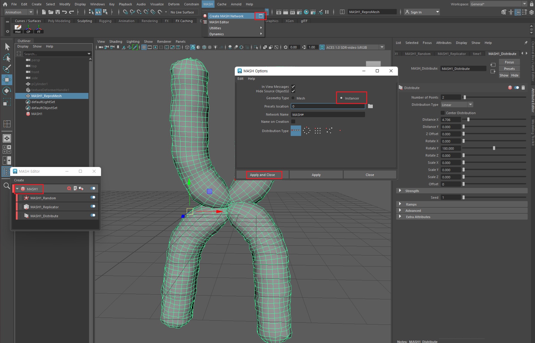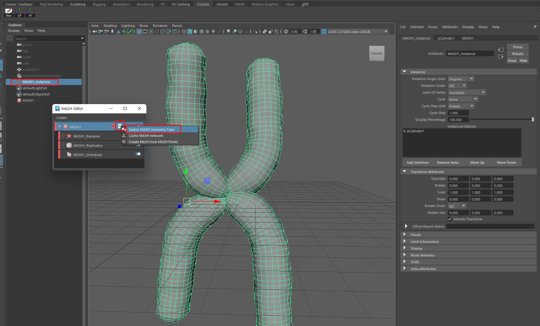 염색체 개체 수를 확장하기 위해 MASH Geometry를 선택한 상태에서 MASH 옵션을 실행한다. 이때 Mesh가 아닌 'Instancer'를 선택해야 한다.**