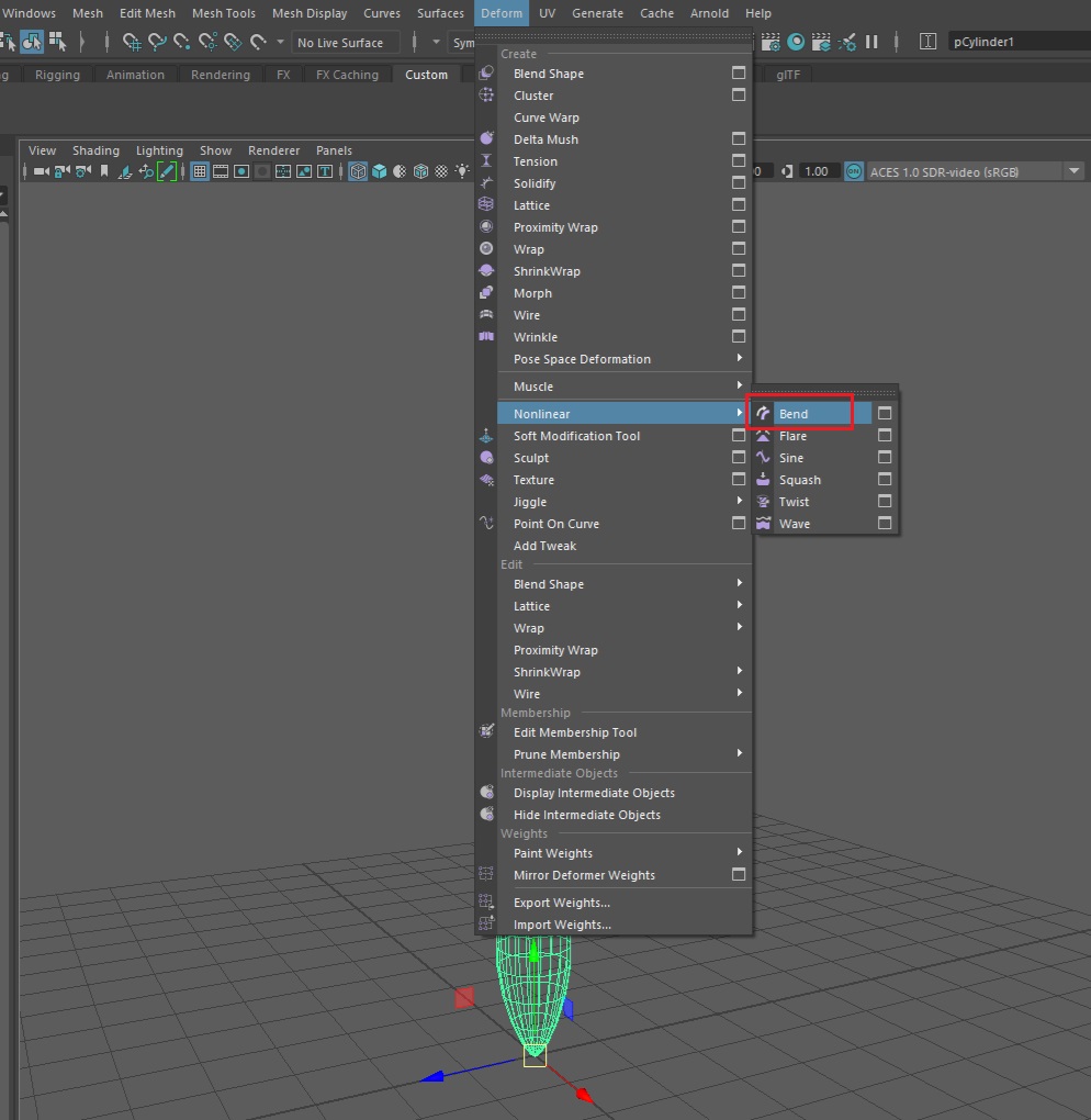 염색체의 구부러진 하단을 표현하기 위해 염색체 모델링을 선택한 뒤, Modeling메뉴의 'Deform > Nonlinear > Bend'를 클릭한다.